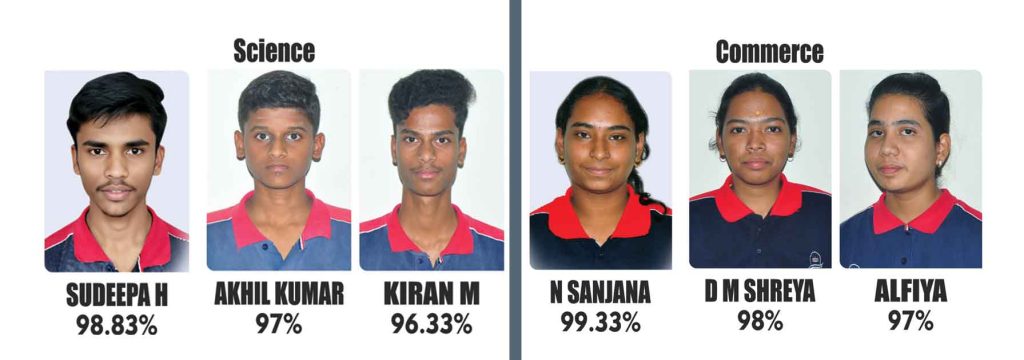 ವಾಣಿಜ್ಯ ವಿಭಾಗದ ವಿದ್ಯಾರ್ಥಿನಿ ಎನ್.ಸಂಜನಾ ಒಟ್ಟು 596 ಅಂಕಗಳನ್ನು ಪಡೆಯುವ ಮೂಲಕ ರಾಜ್ಯಕ್ಕೆ 5ನೇ ರ್ಯಾಂಕ್ ಹಾಗೂ ಜಿಲ್ಲೆಗೆ ಮೊದಲ ಸ್ಥಾನ ಪಡೆದು ಸಾಧನೆ ಮಾಡಿದ್ದಾರೆ. ವಿಜ್ಞಾನ ವಿಭಾಗದ ಎಚ್.ಸುದೀಪ್ 593 ಅಂಕ ಗಳಿಸಿ ರಾಜ್ಯಕ್ಕೆ 7ನೇ ರ್ಯಾಂಕ್ ಹಾಗೂ ಜಿಲ್ಲೆಗೆ ಎರಡನೇ ಸ್ಥಾನ ಪಡೆದಿದ್ದಾರೆ.